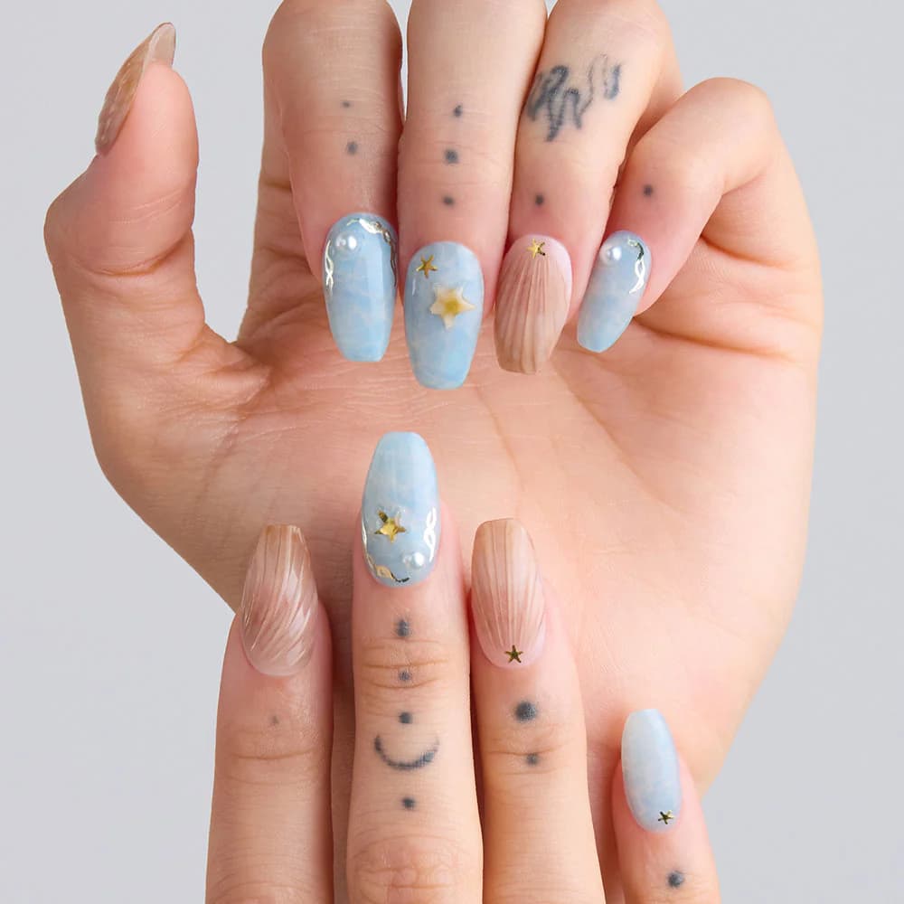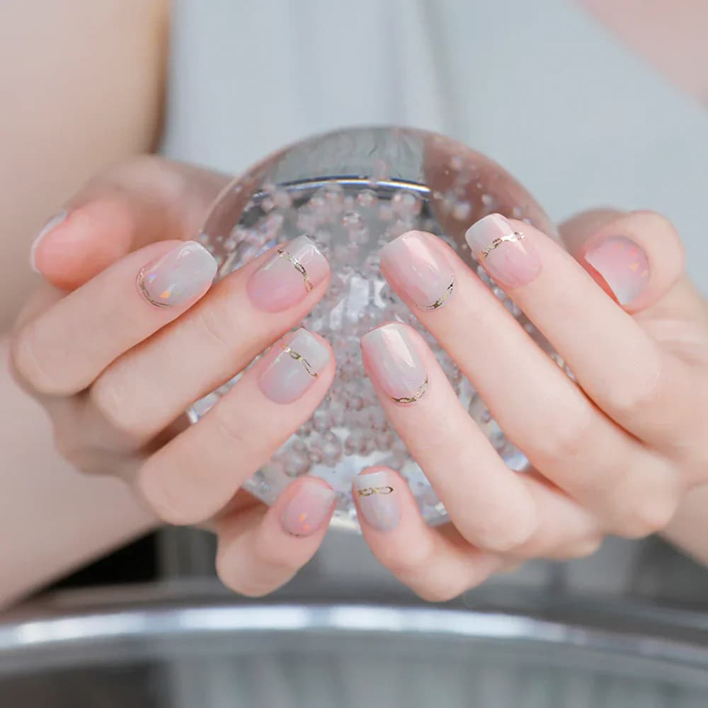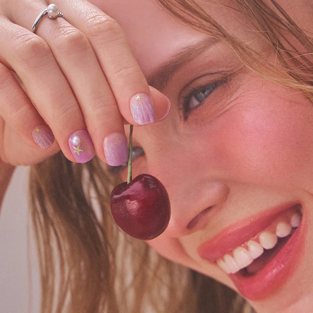 Zemindeki o yumuşak, yarı şeffaf pembe ton, tırnağın kendi doğal rengiyle bütünleşerek inanılmaz temiz ve sağlıklı bir görünüm yaratıyor. Ama asıl sihir, üzerine serpiştirilmiş o incecik, denizyıldızı ışıltılarında gizli. Işık tırnaklarınıza vurdukça, pembeden şeftaliye dönen, hafif holografik bir yansıma ortaya çıkıyor. Bu, “tırnağımda bir şey var ama ne olduğu tam anlaşılmıyor” dedirten o sofistike etkiyi yaratıyor.