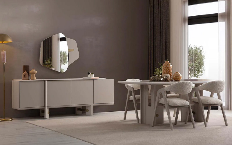 Bir yemek odasında tasarımın gücü malzeme ve renk seçiminde gizlidir. Açık renkler ferahlık getirir, koyu tonlar, alanı daha karakterli kılar. Ahşap yüzeyler sıcak bir atmosfer oluşturur, metal ve mermer detaylar modernliği vurgular. Storish, bu kombinasyonları sade bir dengeyle birleştirir. Kumaş kaplamalı sandalyeler konfor sağlar ve aynalı konsollar ışığı dengeler. Bu şekilde yemek odası modelleri yalnızca bir mobilya değil uzun süre kullanılacak bir deneyim sunulur.